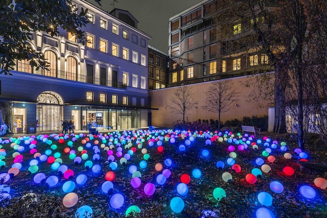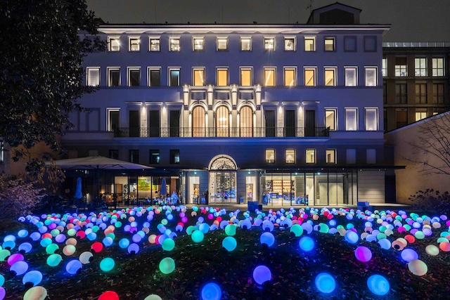 Nel giardino della Fondazione, aperto a tutti, Giancarlo Neri ha creato l’Albero Orizzontale, oltre 500 palle bianche che la sera si illuminano di luci colorate.