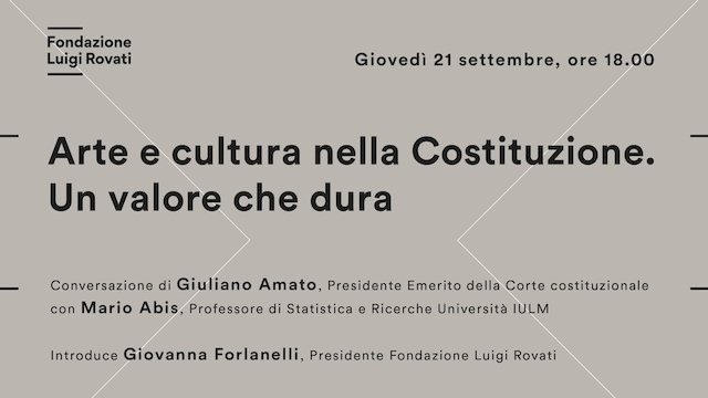 Oggi la Costituzione è più attuale che mai e viene costantemente richiamata, dal Presidente della Repubblica in giù, come norma fondamentale della Repubblica, che non solo regola ma anche detta gli orientamenti che il nostro paese e la nostra comunità debbono avere. Questo tocca anche un carattere fondamentale della società italiana che è quello della cultura nelle sue diverse declinazioni, a cominciare dall’arte: la Costituzione ne parla e ne fornisce un inquadramento. Questo è fra i temi fondanti della conversazione di Giuliano Amato con Mario Abis. Si parla molto di cultura, spesso in modo economicista, come strumento e non come finalità fondamentale della nostra comunità. Tornare alla Costituzione dà significato al valore della cultura come fattore di crescita e coesione sociale: è forse la prima volta che ciò viene fatto, e costituisce un’angolatura nuova e politicamente rilevante nelle discussioni sulla cultura, anticipa Giovanna Forlanelli.