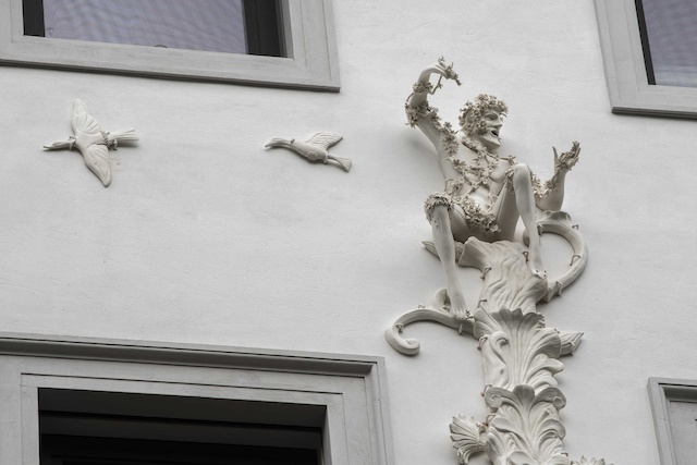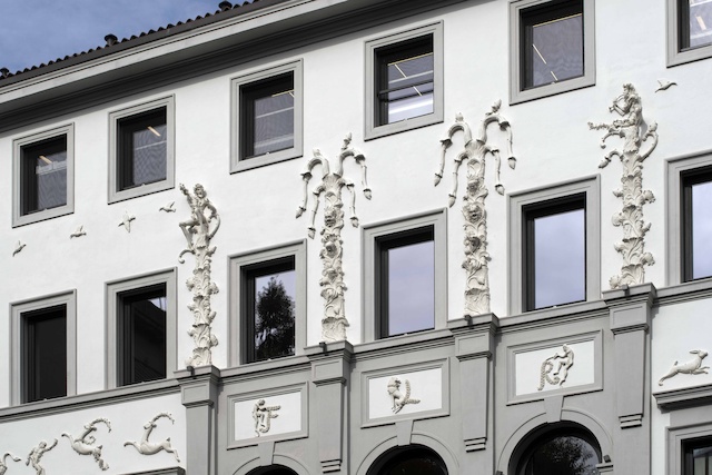 L’installazione prende avvio nella hall d’ingresso del palazzo, che si anima con visi d’ispirazione etrusca racchiusi in quattro medaglioni ricchi di elementi floreali. Al piano nobile nella sala d’ingresso le sculture di personaggi dai tratti antichi si muovono in una danza circolare, sospese nel vuoto, mentre sulla parete una coppia di uccelli vola verso l’esterno, all’aria aperta. Sulla facciata che guarda il giardino si protendono quattro alberi abitati da visi e da intere figure antropomorfe che guardano oltre, circondate da cervi, lepri, uccelli che corrono liberi sullo spazio della facciata.