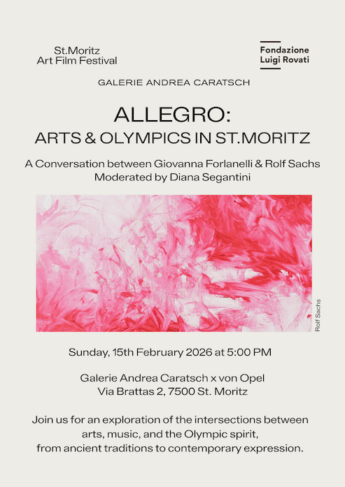 “Allegro: Arte & Olimpiadi a St. Moritz” è l'incontro in programma domenica 15 febbraio alle ore 17.00 presso la Galerie A. Caratsch x von Opel di St. Moritz, una conversazione tra Giovanna Forlanelli, Presidente della Fondazione Luigi Rovati, e l’artista Rolf Sachs, moderato da Diana Segantini, Managing Director del St. Moritz Art Film Festival.