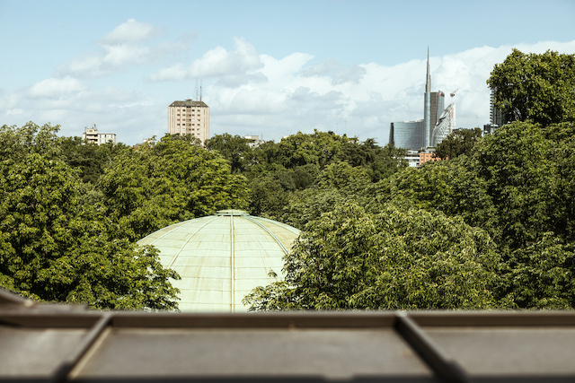 Lungo tutta la sala una grande vetrata panoramica dilata lo sguardo dai giardini pubblici Indro Montanelli di Porta Venezia agli edifici simbolo di Milano, come il Museo di Storia Naturale, il Planetario di Piero Portaluppi, la Torre Rasini degli architetti Ponti-Lancia, fino ad abbracciare le architetture contemporanee che hanno ridefinito lo skyline della cittĂ .