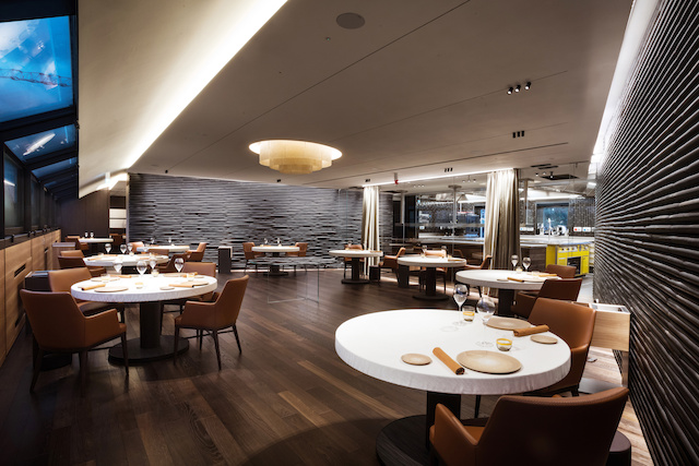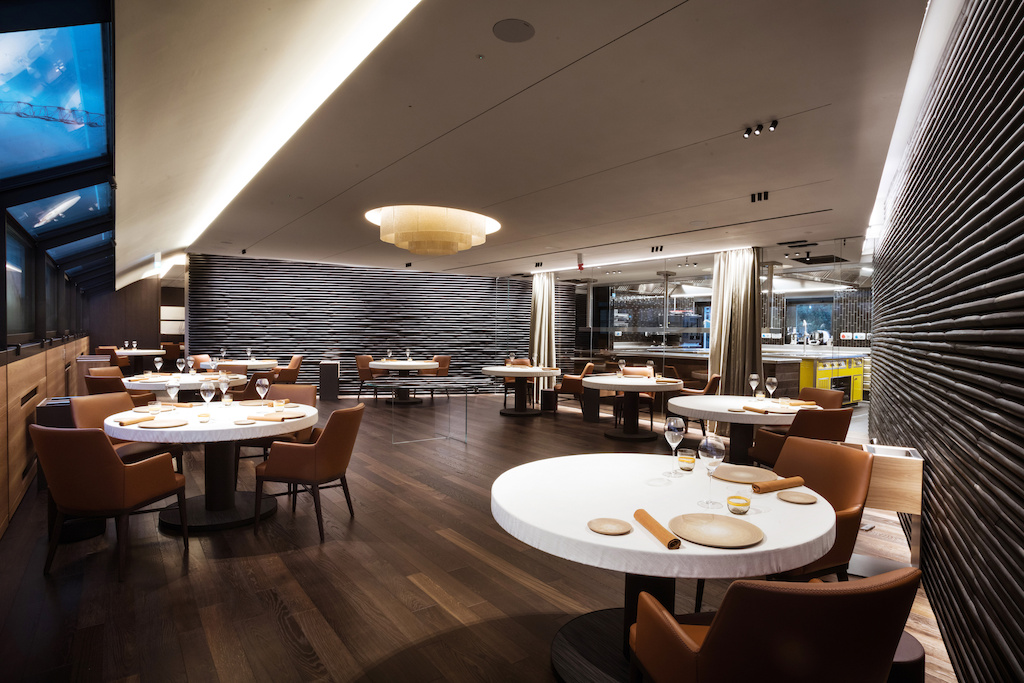 Un iconico bancone semi circolare in ottone bronzato detta la scansione dello spazio e orienta lo sguardo verso il verde degli esterni. Sulla parete, lâacquarello dal titolo Entrare nel tempo, omaggio a L.R. di Mauro Ceolin, il primo protagonista del progetto di promozione dellâarte italiana sviluppato dalla Fondazione in collaborazione con lo Chef.