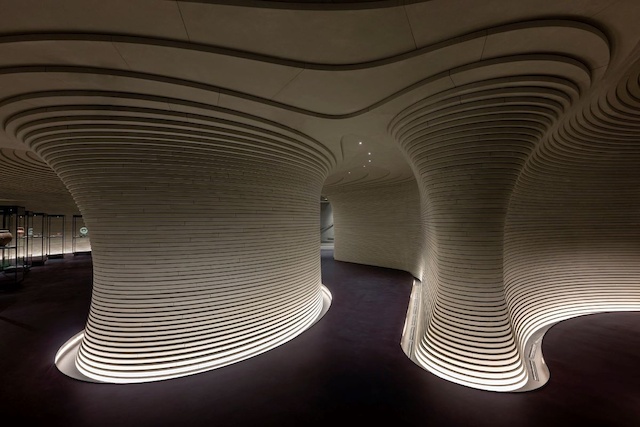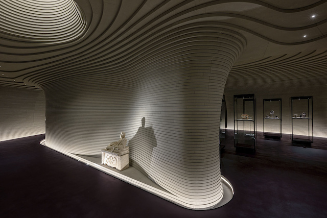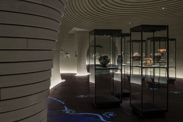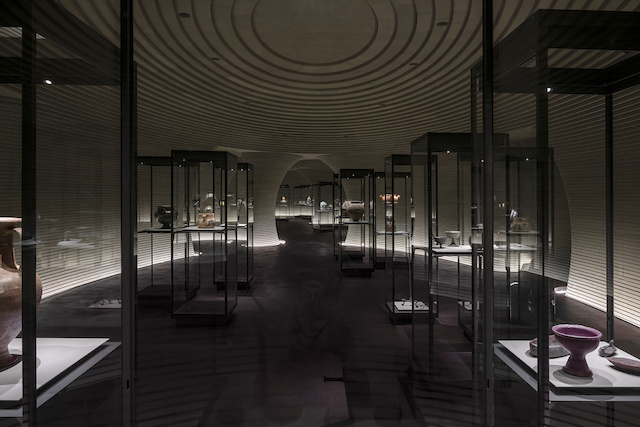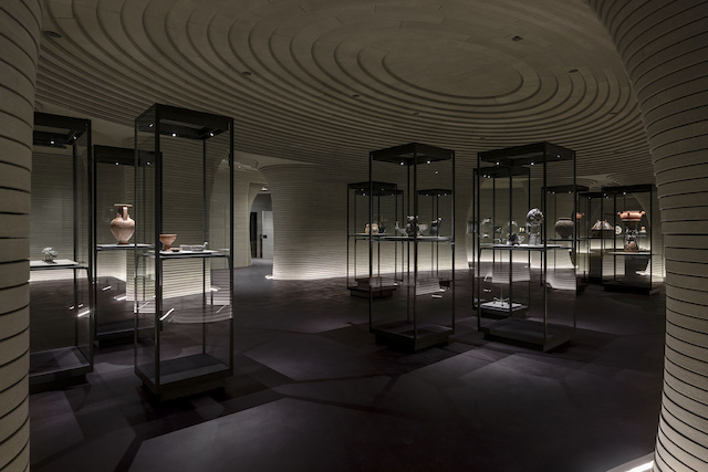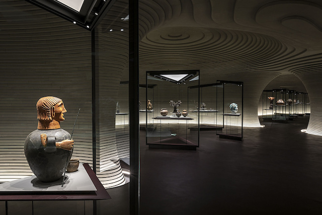 Nel Piano Ipogeo, l'architettura in pietra ospita parte del percorso museale, muovendosi all'interno delle cupole tra le vetrine triangolari in cristallo che espongono le opere d'arte etrusche.